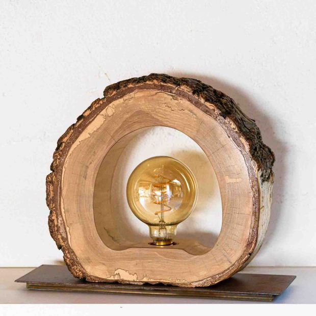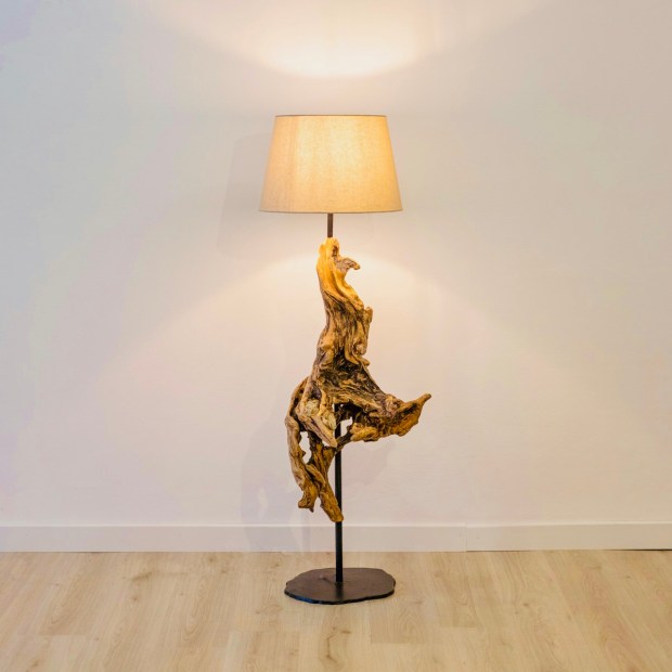 Lampada da terra creata con legno scolpito dalla natura, con frammenti di sassi incastonati.