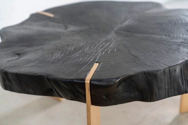 Tavolino in legno di cedro, trattato con la tecnica “Shou Sugi Ban” che prevedeva la bruciatura tramite fiamma