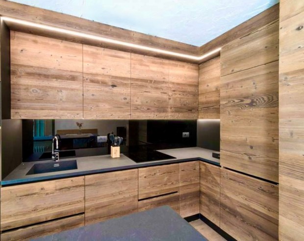 Cucina creata con legno vecchio, spazzolato e verniciato all’acqua.