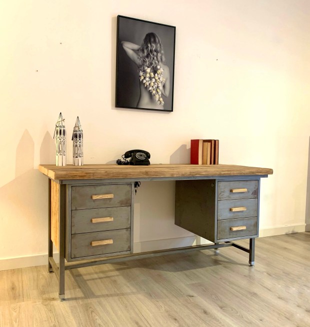 Scrivania in ferro anni 70. Sostituito il coperchio in formica e le maniglie in ferro con legno antico massello.