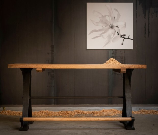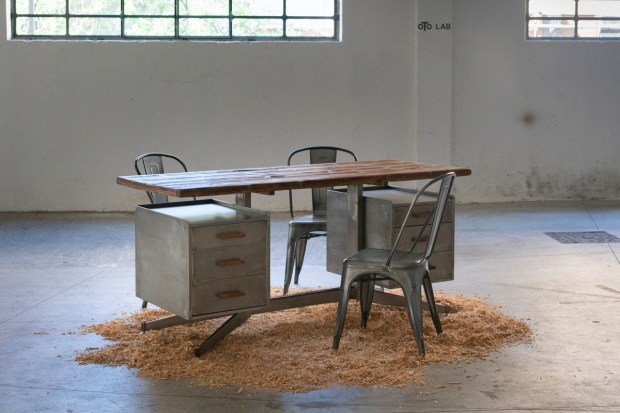 Tavolo con piano in noce massello recuperato da un biliardo antico, gambe in ferro recuperata da un tornio dell’ottocento