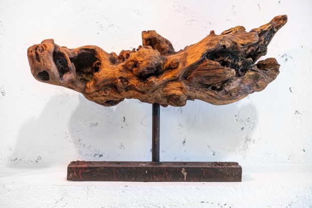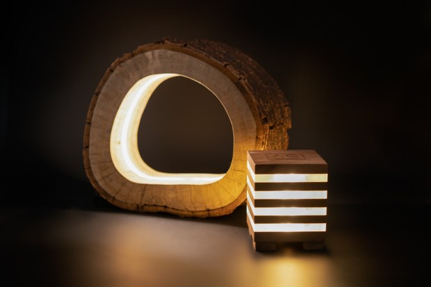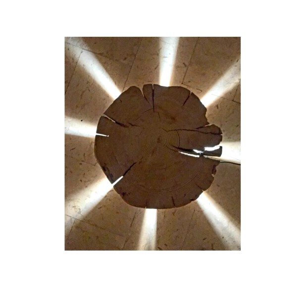 Vecchio tronco di legno finemente scavato per l’inserimento di luce led che permette attraverso le fenditure di irradiare sorgenti luminose.