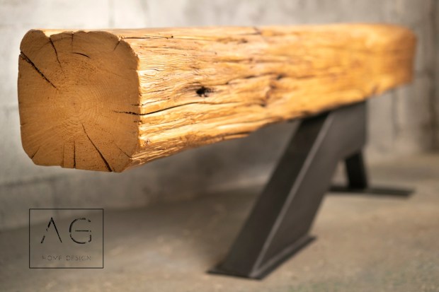 Panca con seduta ricavata da vecchia trave e supporto da putrella di ferro.