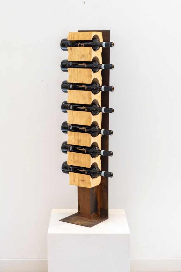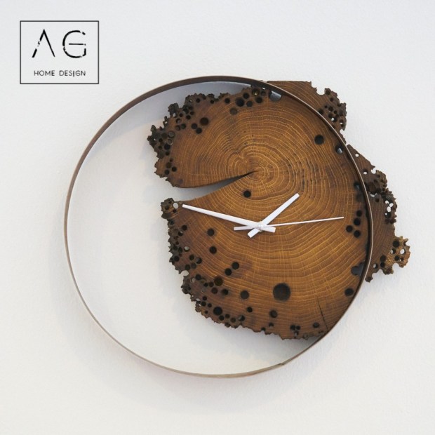 Orologio creato inserendo del legno di briccola in una lamina circolare di ferro, trattato con cera d’api naturale.