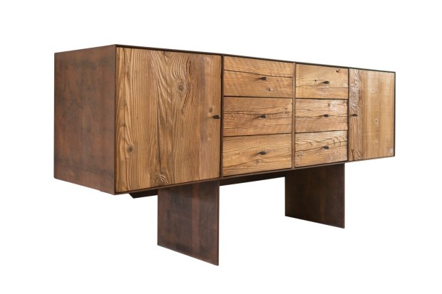 Credenza con ante e cassetti in legno massello, interno in multistrato di betulla, racchiusa da una struttura in ferro, finitura …